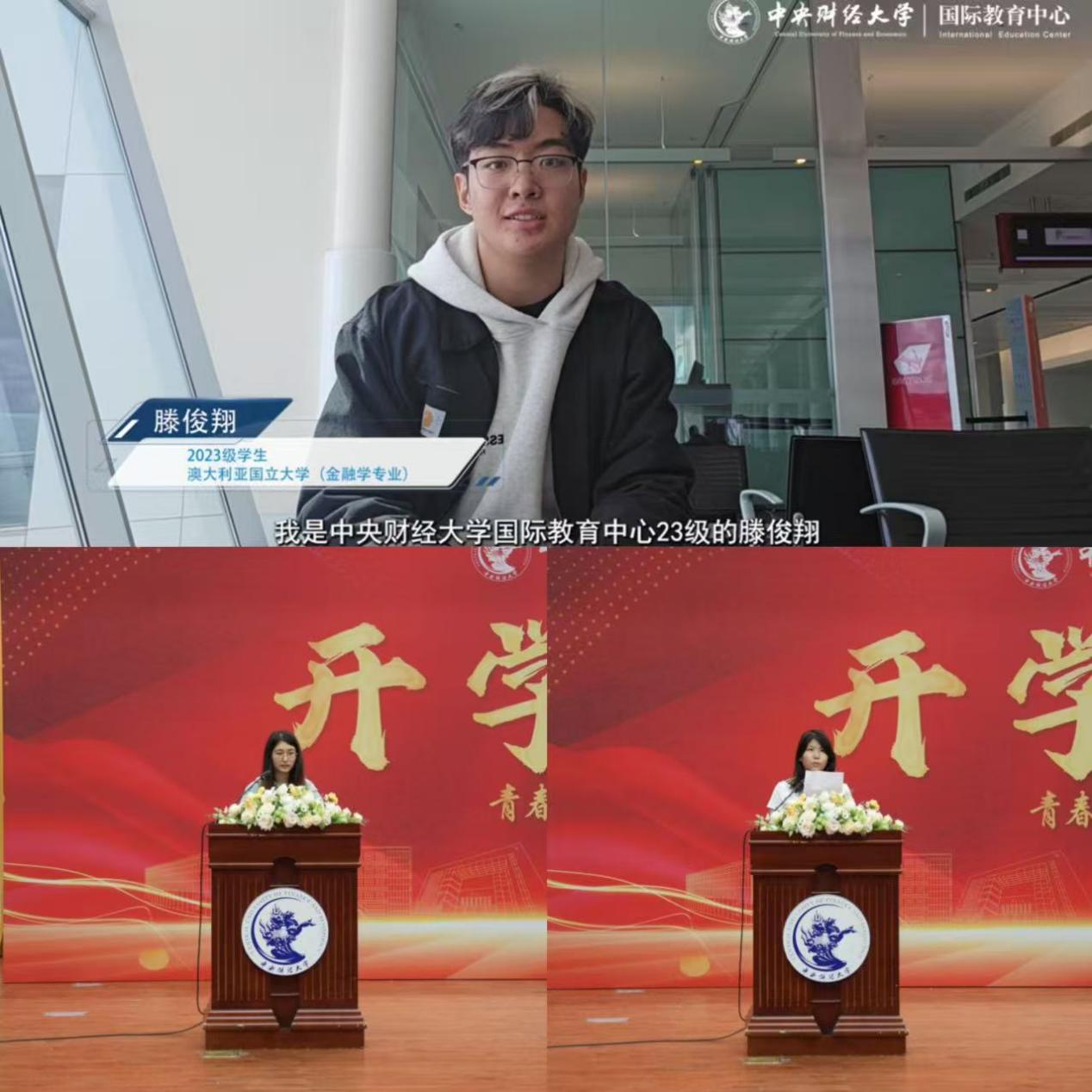 2023级优秀员工代表滕俊翔在澳大利亚国立大学以视频的方式向学弟学妹们送来了远程祝福。他通过回顾在中财大的学习经历,分享了平衡学业与生活的心得,鼓励同学们大胆尝试,发掘校园生活的多种可能性。